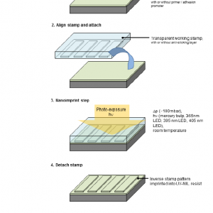 Our portfolio covers materials for the classical thermal NIL (T-NIL), in which a thermoplastic polymer is used, as well as UV-NIL, in which a liquid formulation is photo crosslinked upon photo exposure. With our technological expertise and know-how we are able to find the right material for your process and applications. Please contact us for your technical support!