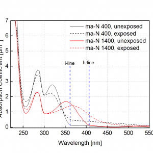 • Effective for broadband, g-line, h-line or i-line exposure, laser direct writing at 350…450 nm and e-beam lithography