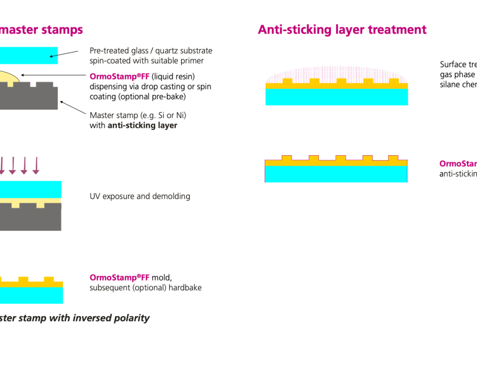 Prinzipiell existieren zwei unterschiedliche NIL-Technologien: die thermische NIL (T-NIL), in der thermoplastische Polymere Verwendung finden, und die Photo-NIL bzw. UV-NIL, in der photo-vernetzbare Formulierungen eingesetzt werden. Mit unserer langjährigen Erfahrung sind wir in der Lage, den für Sie passenden Prozess und das am besten geeignetste Material für Ihre Anwendung zu finden. Kontaktieren Sie uns für tiefergehende Informationen.