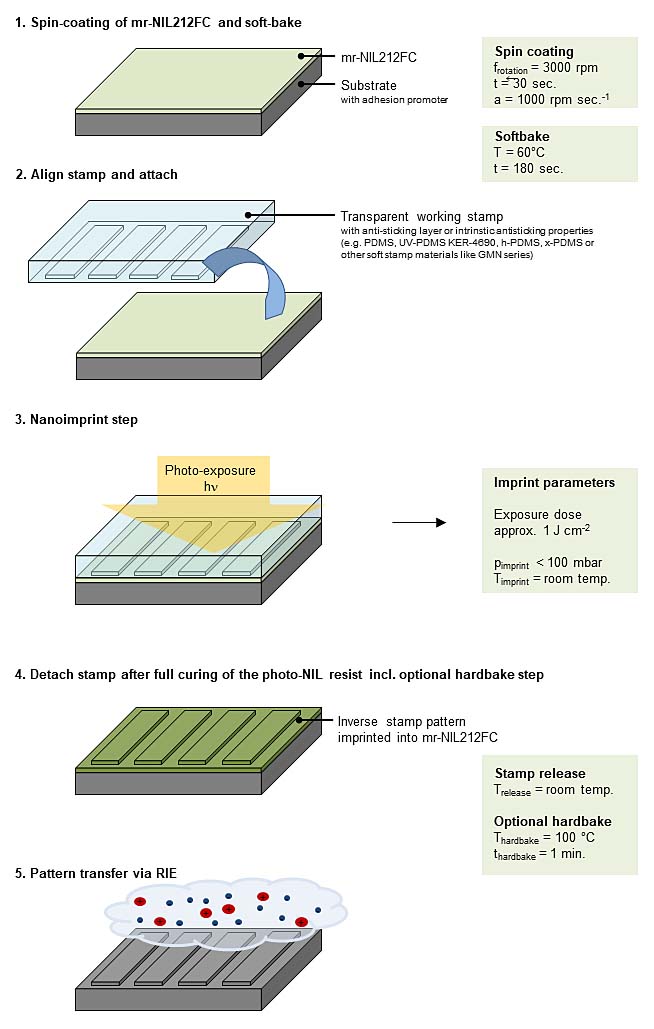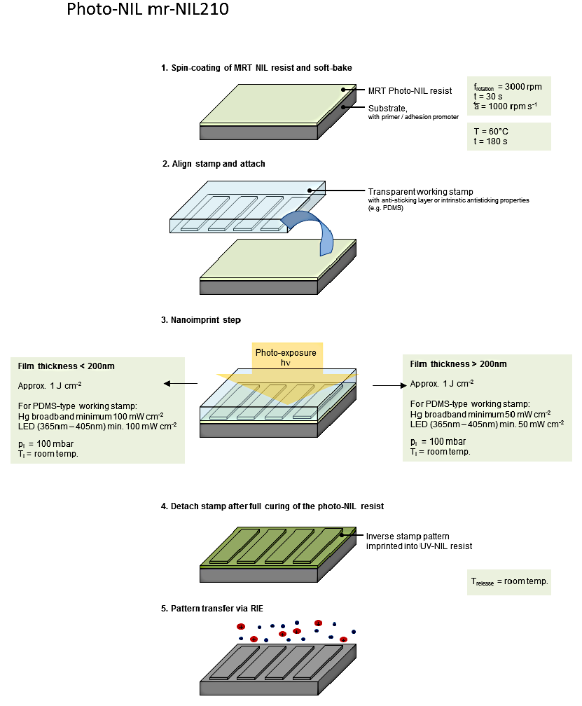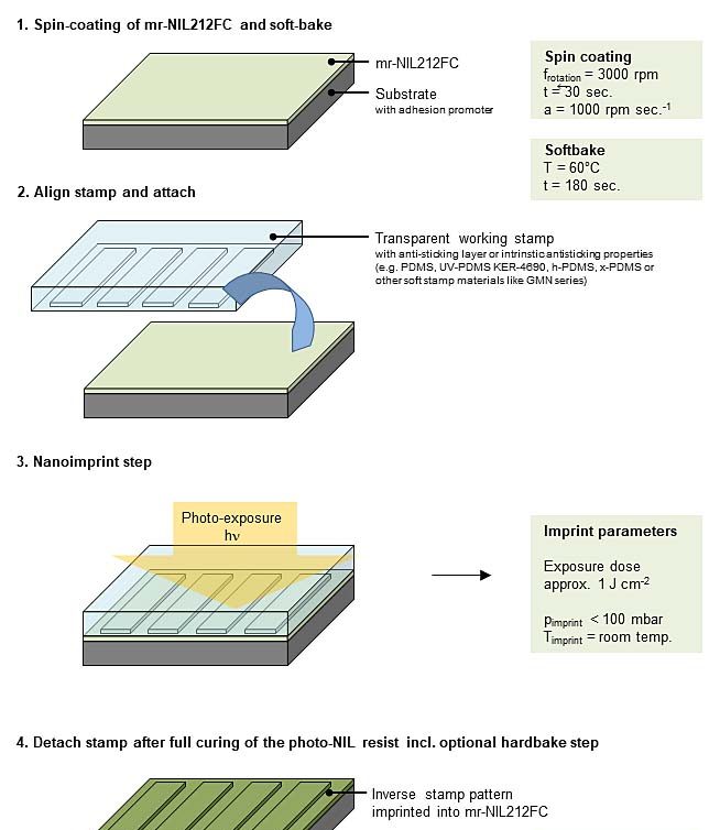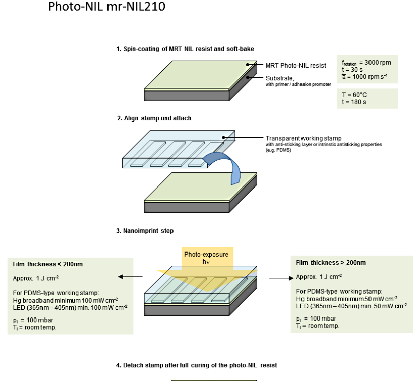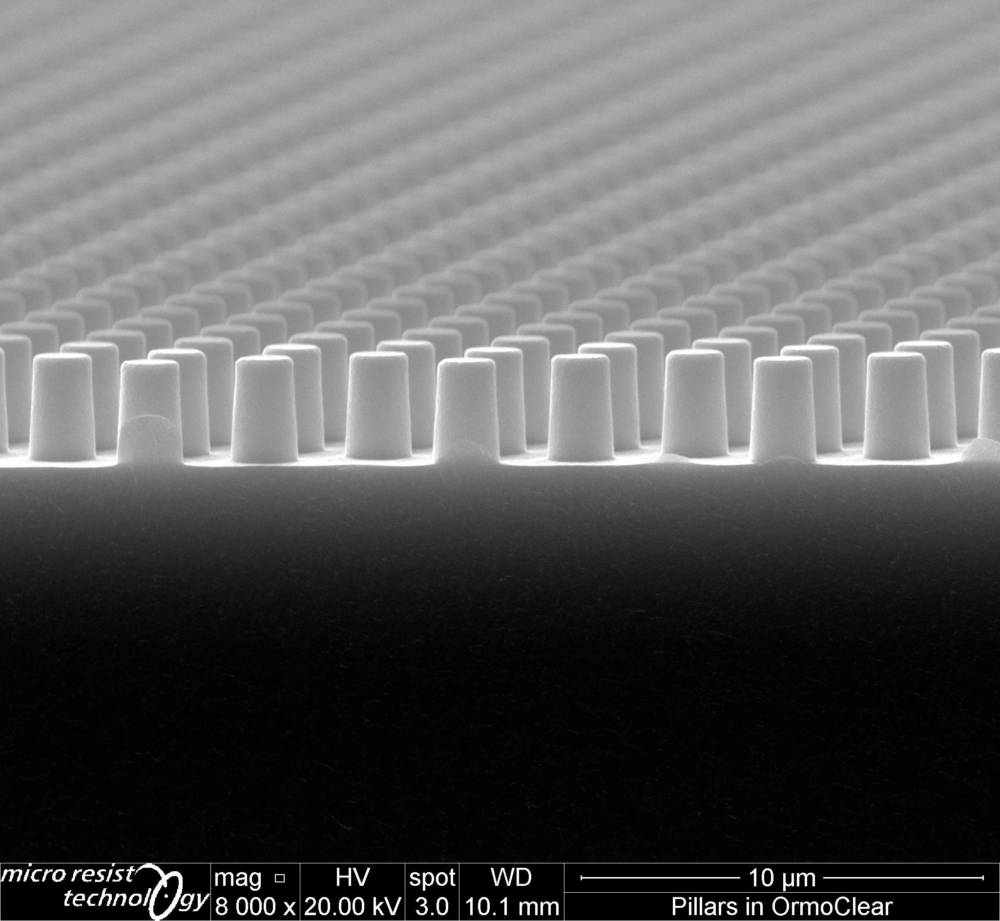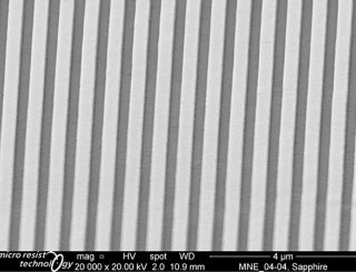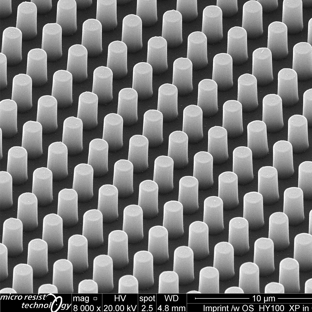 Die micro resist technology GmbH bietet seit 1999 maßgeschneiderte Resistformulierungen für die Nanoimprint-Lithographie (NIL) an. Wir legen dabei besonderen Wert auf herausragende Filmbildungs- und Prägeeigenschaften sowie eine exzellente Plasmaätzstabilität und Strukturtreue. Weiterhin bieten wir hochinnovative Materialien, die eng an dem technischen Fortschritt in der Industrie entwickelt wurden. Wir sind in der Lage unsere Materialien an die Kundenwünsche anzupassen, sowohl in den gewünschten Schichtdicken, als auch in deren intrinsischen Materialeigenschaften. Die Nanoimprint-Resiste werden meist als Ätzmaske zur Strukturübertragung in unterschiedliche Substrate wie Si, SiO2, Al oder Saphir, eingesetzt.