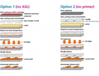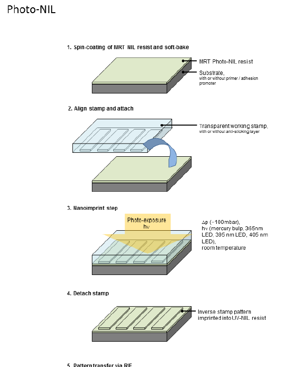 Prinzipiell existieren zwei unterschiedliche NIL-Technologien: die thermische NIL (T-NIL), in der thermoplastische Polymere Verwendung finden, und die Photo-NIL bzw. UV-NIL, in der photo-vernetzbare Formulierungen eingesetzt werden. Mit unserer langjährigen Erfahrung sind wir in der Lage, den für Sie passenden Prozess und das am besten geeignetste Material für Ihre Anwendung zu finden. Kontaktieren Sie uns für tiefergehende Informationen.