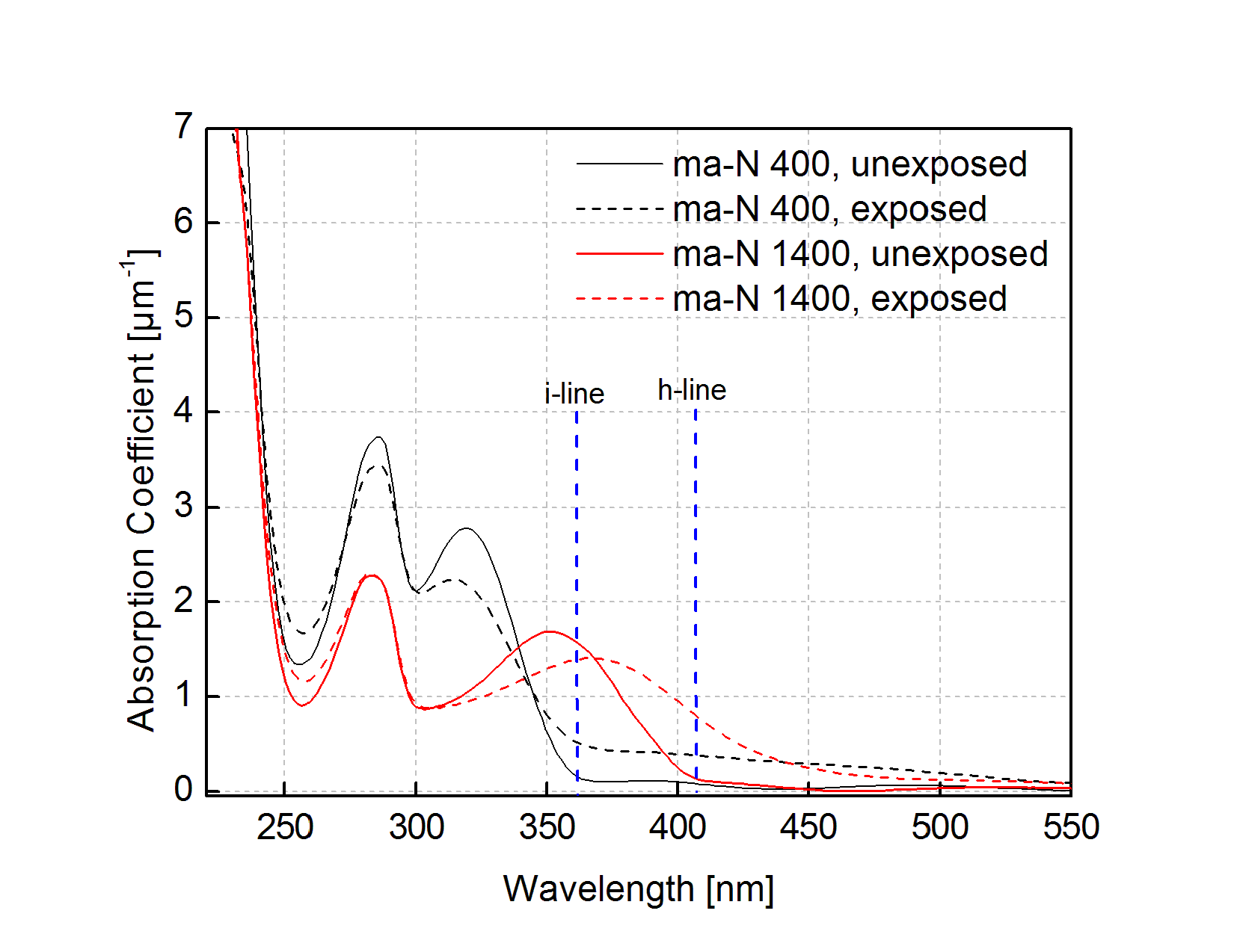 • Geeignet für Breitband- und i-Linien-Belichtung, Tief-UV- oder Elektronenstrahlbelichtung,  oder Laserdirektschreiben @ 405 nm