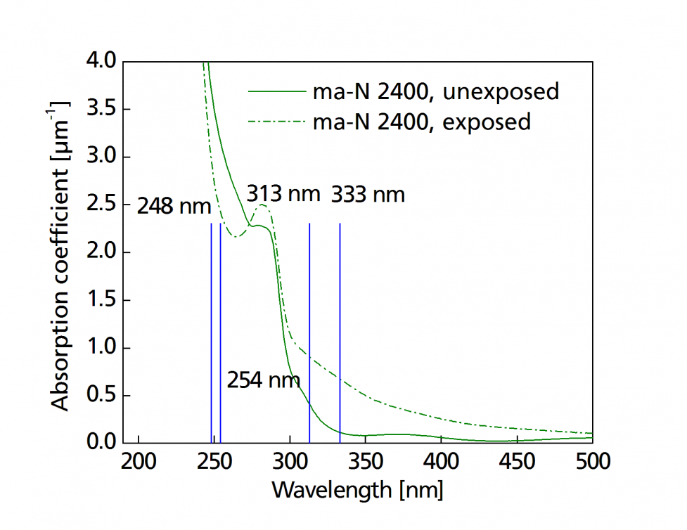 • Geeignet für Breitband-, g-Linien- , h-Linien-oder i-Linien-Belichtung, Laser-Direktschreiben bei 350…450 nm und Elektronenstrahllithographie