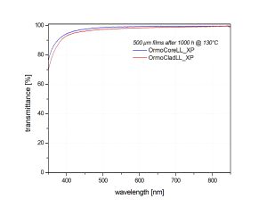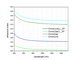 Mit ihren glasähnlichen Eigenschaften hinsichtlich Transparenz und Brechungsindex, bieten die UV-härtbaren Produkte der Hybridpolymere nicht nur beste Voraussetzungen für Anwendungen als mikrooptische Elemente wie Mikrolinsen und Mikrolinsenarrays, sondern auch für optische Lichtwellenleiterstrukturen. Tatsächlich haben die Produkte OrmoCore und OrmoClad, wie sich leicht aus den Namen ableiten lässt, ihre ursprüngliche Anwendung in diesem Bereich. Durch den niedrigen optischen Verlust bei den wichtigen Data-und Telekommunikationswellenlängen 1310 nm und 1550 nm eignet sich OrmoCore als lithographisch strukturierbarer Polymerwellenleiter und OrmoClad als dazu passendes Mantelmaterial. Um die Transparenz der klassischen Wellenleiterprodukte unter 450 nm zu verbessern und Einkoppelverluste durch Anpassung des absoluten Brechungsindex‘ an den Brechungsindex von Glasfasern zu verringern, entwickelte die micro resist technology im Projekt „PolyChrome Berlin“ (http://www.polyphotonics-berlin.de) Materialprototypen, die einen angepassten absoluten Brechungsindex um 1.45 und weiter verringerte Dämpfungswerte bei 1310 nm und 1550 nm aufweisen. Die Transmission konnte in einer 500 µm Schicht auf 96 % bei 400 nm gesteigert werden. Auch nach 1000 h bei 130 °C weisen die Materialien eine Transmission von >90% auf, womit sie sich durch eine hohe Langlebigkeit auszeichnen.  Die Prototypen können unter den Namen „OrmoCoreLL_XP und „OrmoCladLL_XP“ angefragt werden.